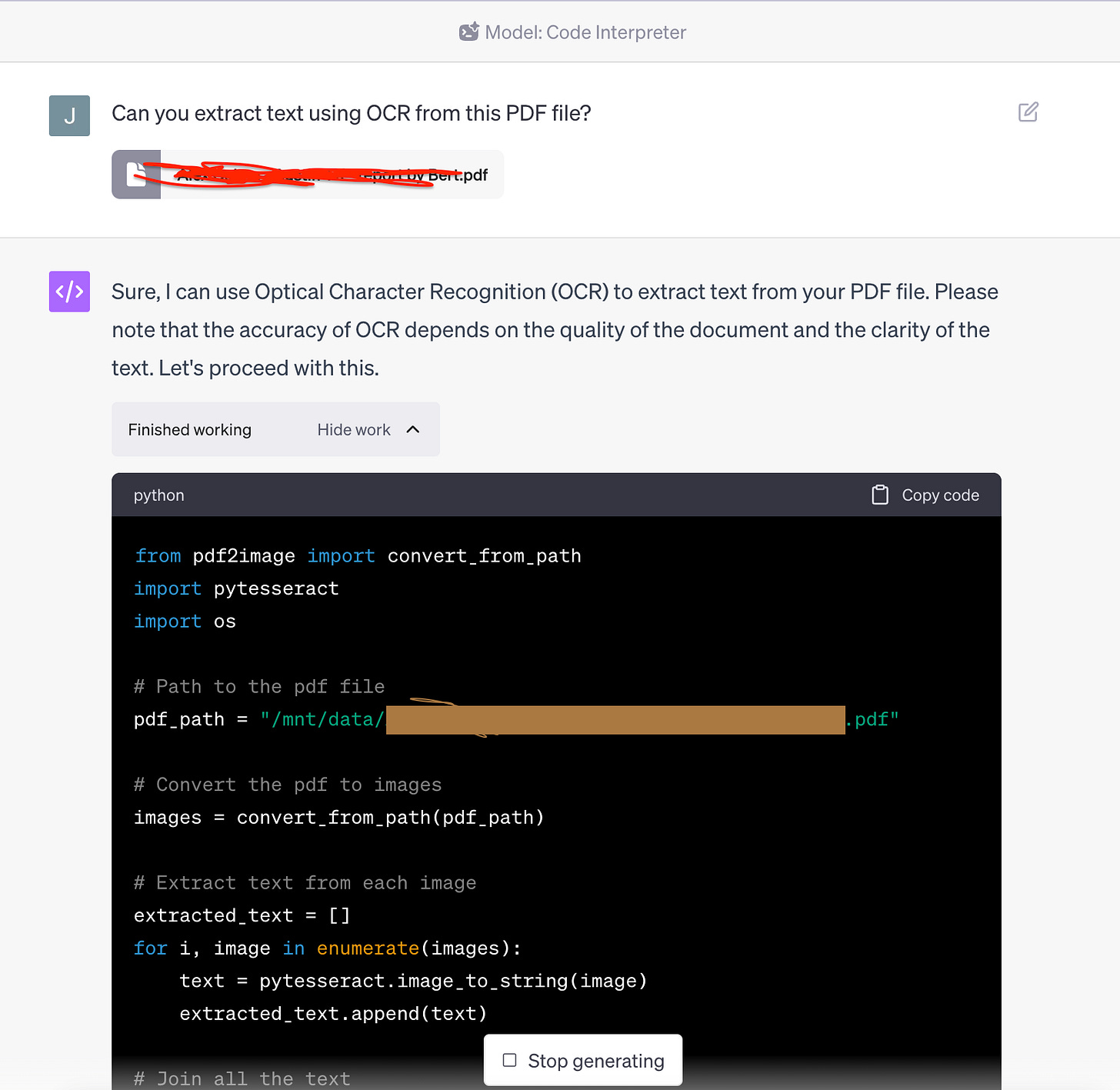 Using ChatGPT you can do an OCR extract on a PDF file! A Plus, this gives you the quick python code to reuse! Simple upload and ask.